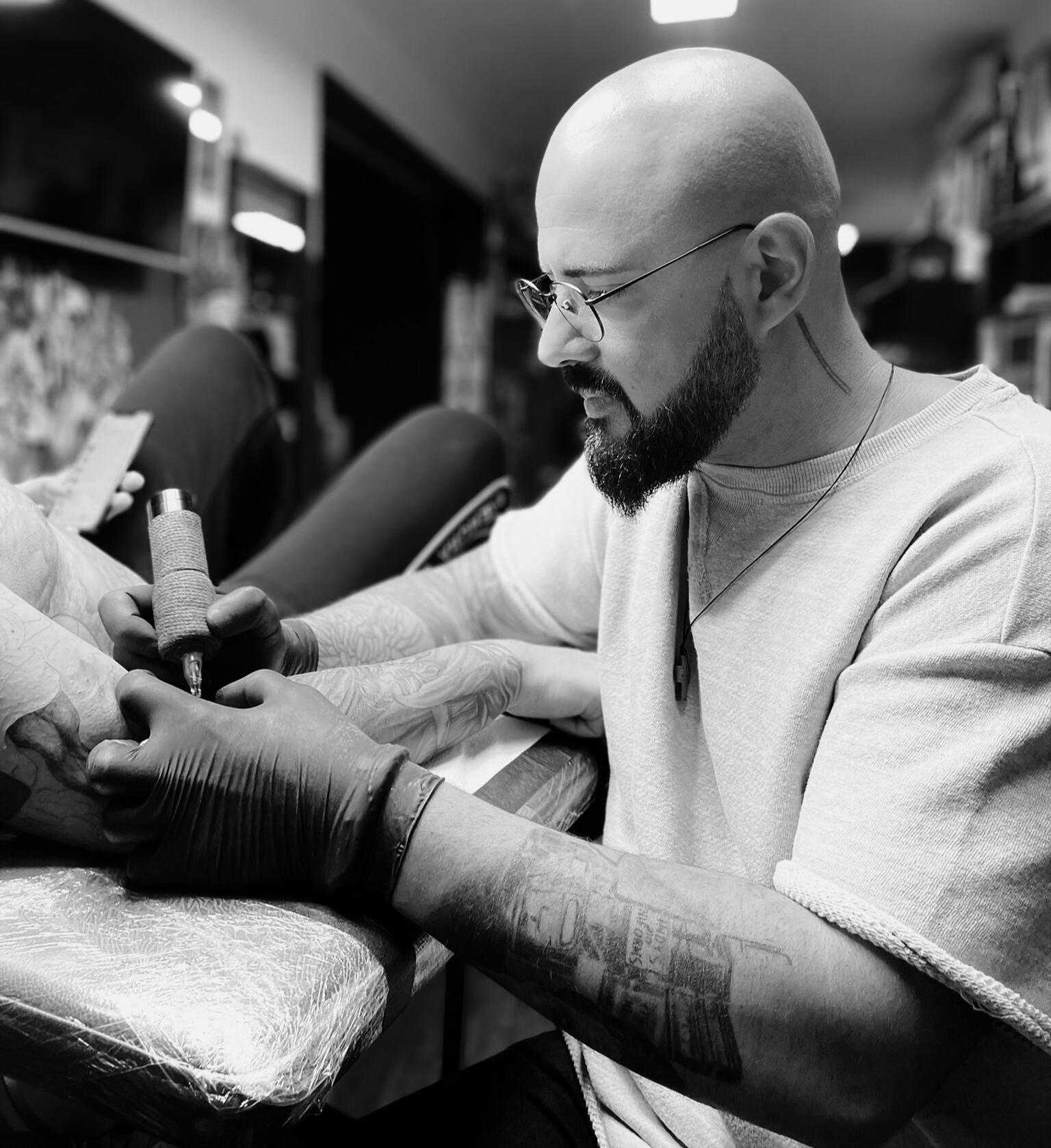 Geboren am 5. Oktober 1984 in Griechenland und im Jahr 1990 nach Deutschland (Wendlingen) ausgewandert, war meine Kindheit bis zum zwölften Lebensjahr von Abenteuern und Entdeckungen geprägt. Als junger Streuner fand ich meine Leidenschaft für das Malen und Zeichnen erst mit 13 Jahren, als ich mich in Graffitikunst im Straßen- und Jugendhausstil versuchte. Doch der entscheidende Wendepunkt kam erst 1996 bei einem Hip-Hop-Jam im Wendlinger Jugendhaus, bei dem mich einige Künstler inspirierten, mich intensiver mit Kunst auseinanderzusetzen.Obwohl ich mich nicht als talentierten Maler bezeichnen würde, bereitete mir das Malen stets Freude, und im Laufe der Jahre habe ich immer wieder gezeichnet und gemalt. Als Feiern, Frauen, Ausbildung und Karriere in den Mittelpunkt meines Lebens rückten, geriet meine künstlerische Leidenschaft für einige Jahre in den Hintergrund. Rückblickend betrachte ich diese Zeit heute nicht mehr als "verlorene Jahre", denn sie haben dazu beigetragen, mich zu dem Menschen zu formen, der ich heute bin.Mit 26 Jahren brachte mich eine Freundin zurück zur Kunst des Zeichnens. Ohne sie wäre ich vielleicht immer noch ein Streuner, der nie in den Genuss eines Tattoos gekommen wäre. Nachdem ich zwei Jahre lang verschiedene Tattoo-Studios durchlaufen hatte, bot sich schließlich die Gelegenheit, meinen eigenen Weg zu gehen. Ohne jegliche Erfahrung entschied ich mich dazu, sämtliche verfügbaren finanziellen Mittel zusammenzukratzen, selbst wenn es bedeutete, das Geld zu verwenden, das eigentlich für meine Hochzeit vorgesehen war. Zu diesem Zeitpunkt wusste mein Vater bereits, dass er eine Hochzeit von mir nicht mehr erleben würde.Daher gebührt mein größter Dank meinem Vater, der am 28. Februar 2017 verstorben ist.